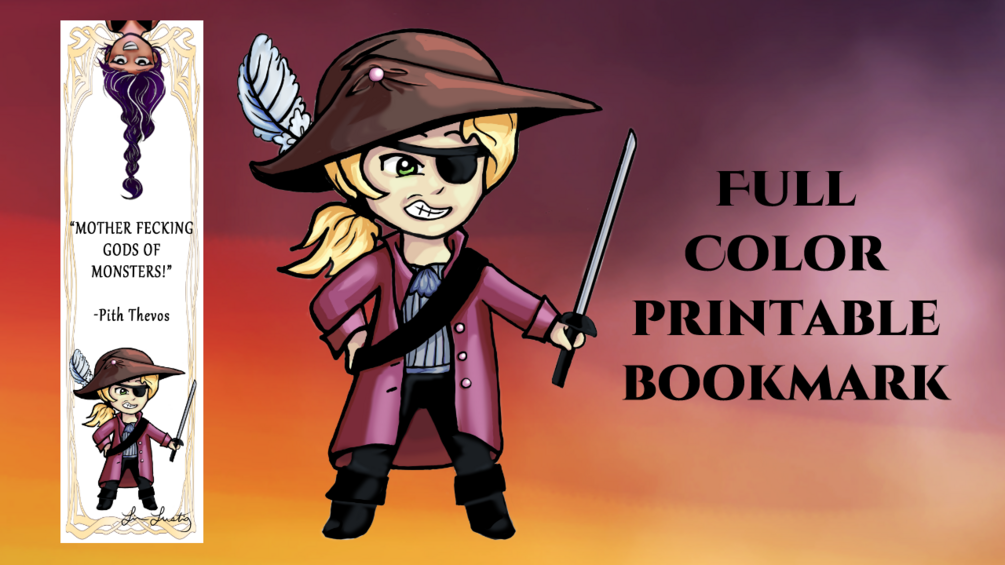 A printable bookmark with colored character art of Pith and Blackbraid from Our Ship Must Sail!